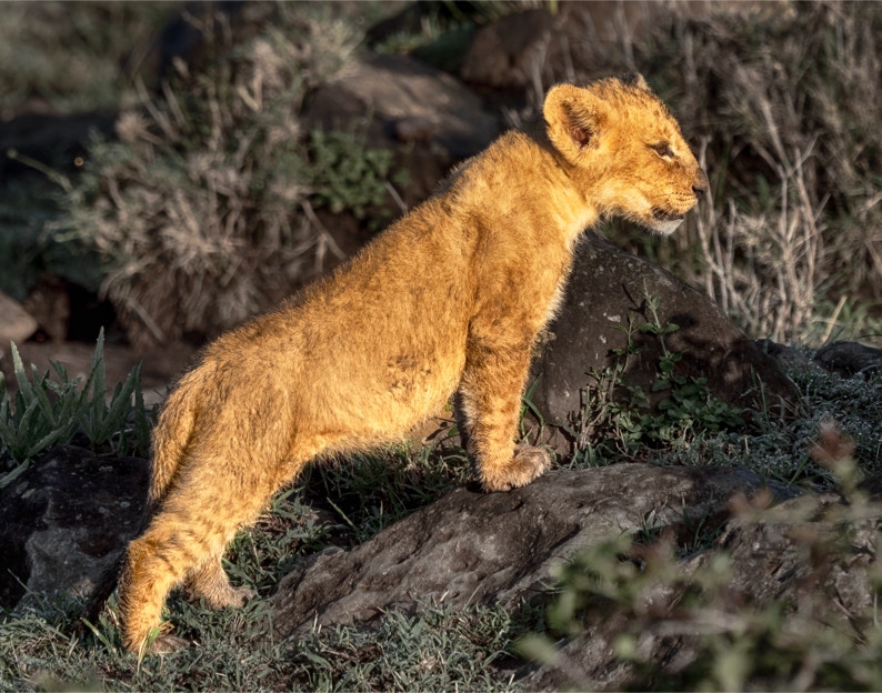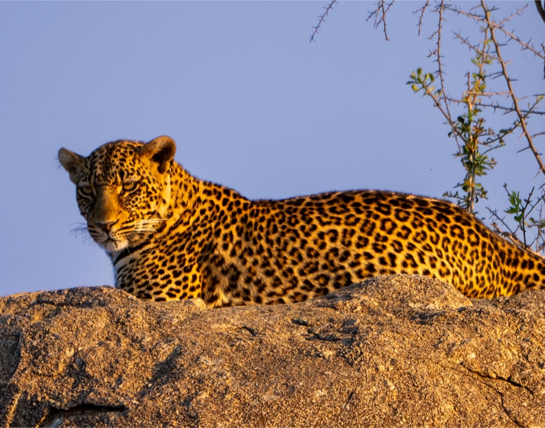 One of the reasons to go to the part of the Serengeti that we visited was to see big cats sitting on rocks. This part of the Serengeti (Camp Sayari) is famous for its rocks and boulders. We were lucky to see this magnificent lion lounging (nor for long). This was shot at ISO 10,000 at 6:30 PM. Denoised with LR enhance, not too bad considering.