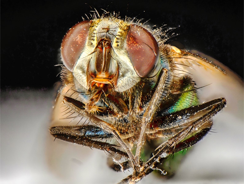 Common house fly. Focus stacking with 78 shots. I need a better hair light for him.