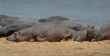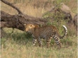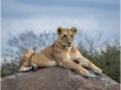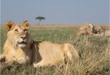A pride of lions finishes off their wildebeest kill. With full bellies, the young males rest nearby.