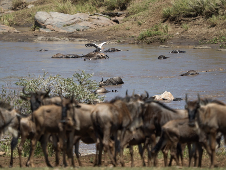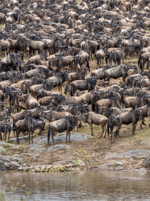 We were lucky to witness one of nature’s greatest spectacles in seeing thousands of wildebeest mass at the edge of the Mara River, then finally jump in one after the other and make their way across… that is if the crocodiles don’t get them first.
