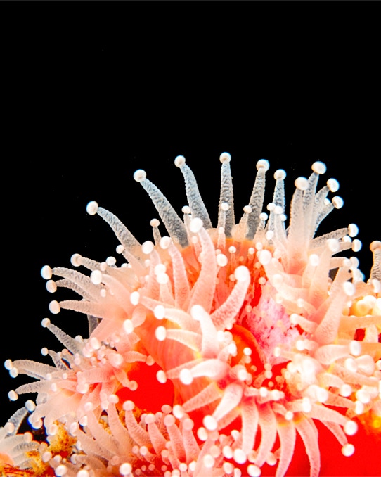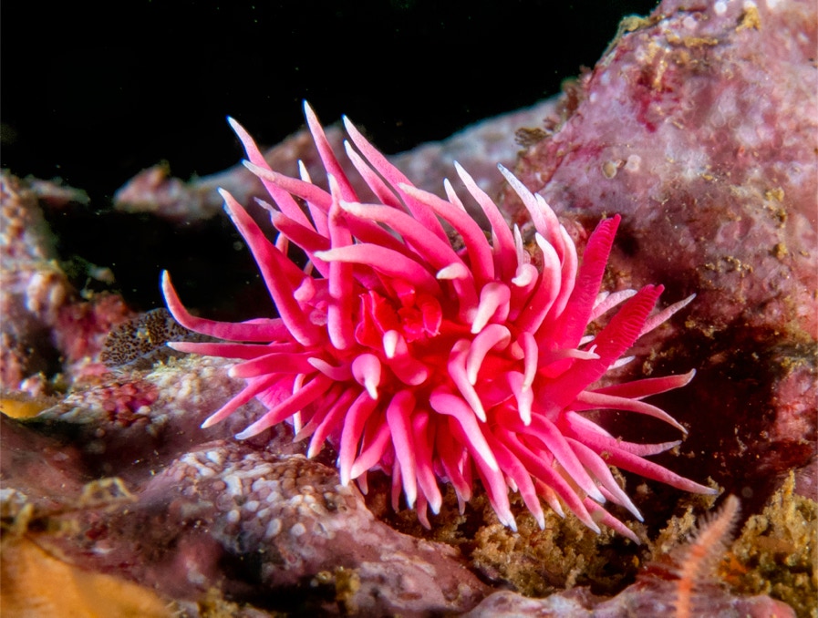Here is a nice little Corynactis shot up into the black from a recent dive on the Giant Stride with friends. Corynactis come in a wide variety of colors, many of which are due to the exact same astaxanthins that make Spanish Shawls so colorful. Corynactis are mean and aggressive. If you put a Corynactis next to say a Metridium, the Corynactis will send out tentacles from her mouth and kill the Metridium.