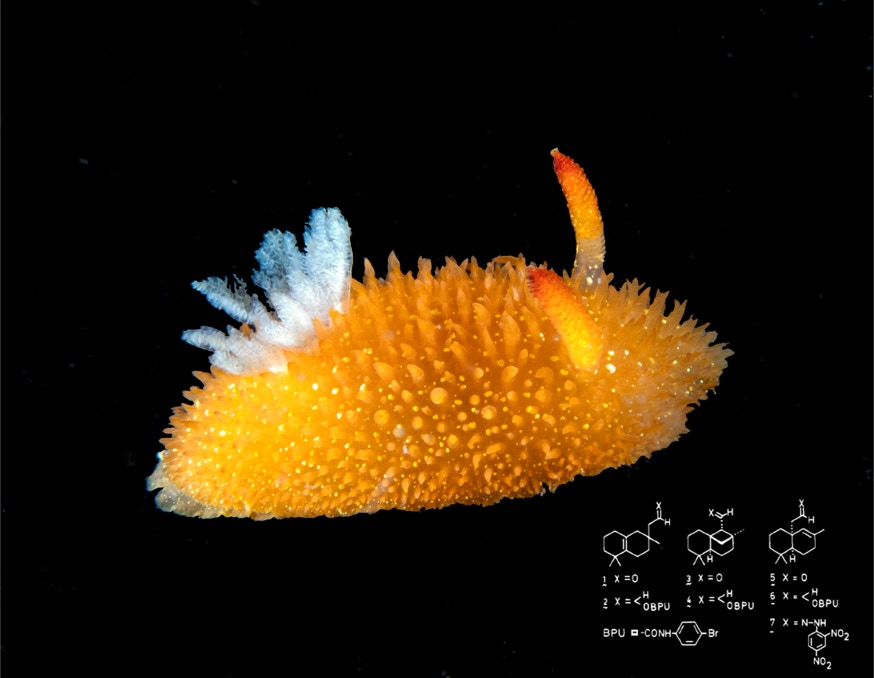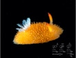 Here is a nice little A. lutea sitting on the telescope felt stage. We were diving with friends on the Giant Stride two weeks ago and this guy showed up. Acanthodoris can make very complex chemicals that are extraordinarily difficult to make in the lab; nudibranchs and their food are very sophisticated in terms of making new compounds.