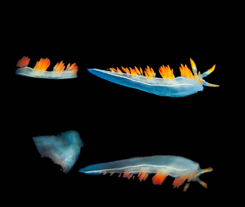 A couple of weeks ago we went diving with friends on the Giant Stride. Mostly we have been doing blue/green water dives looking for jellies, but we did a reef dive at Garden Spot. Here is a nice little Orienthella trilineata (used to be a Flabellina) sitting on the telescope felt stage. These species are one of the few nudibranch species that are known to be aposematic (a new word for me) meaning that they are brightly colored so that they don't get eaten. There is discussion in the literature (Rosenberg, Evolution, 1988, p.1811) about how this can come about with no good answer. In insects it typically is known to be due to kin selection, i.e. if you live in a group it is to the group's advantage if you all look poisonous. In nudibranchs that have a pelagic stage this can not be the driving force. Individual selection would thus appear to be the driving force in the evolution of protective coloring.