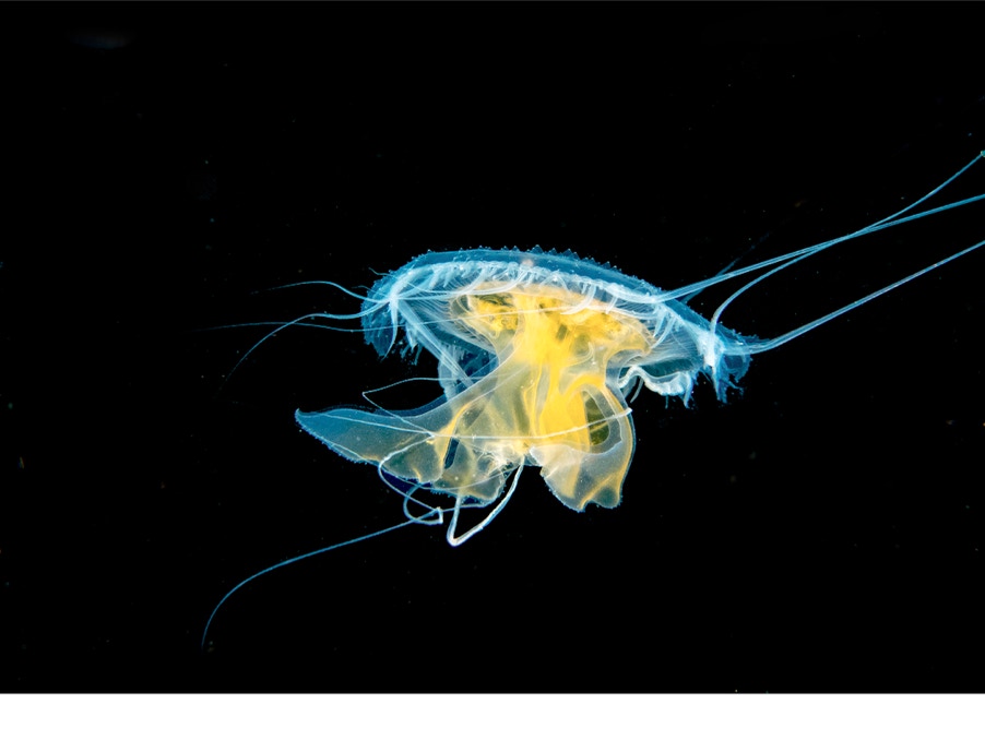 Here is a nice little fried egg jellyfish, Phacellophora camtschatica that we saw on a recent blue water dive with friends on the Giant Stride. It is an interesting creature, its body has no respiratory, circulatory or excretory systems but rather it uses its large surface area to accomplish those functions. It can live in very low oxygen environments by storing oxygen in the gel that makes up much of the bell. In very low oxygen environments, the gel can supply more than 80% of the animal's oxygen needs for up to 48 hours (if I did the math right).