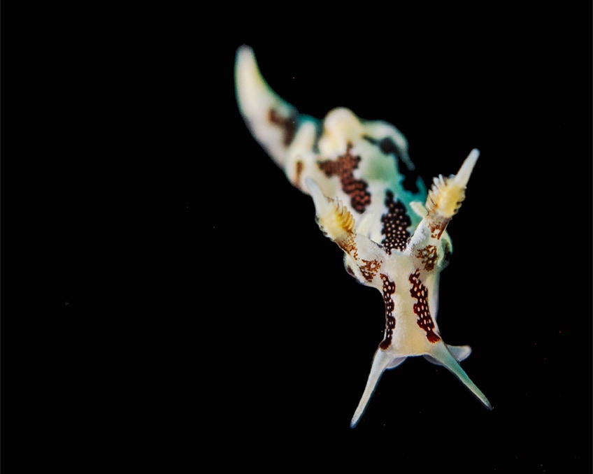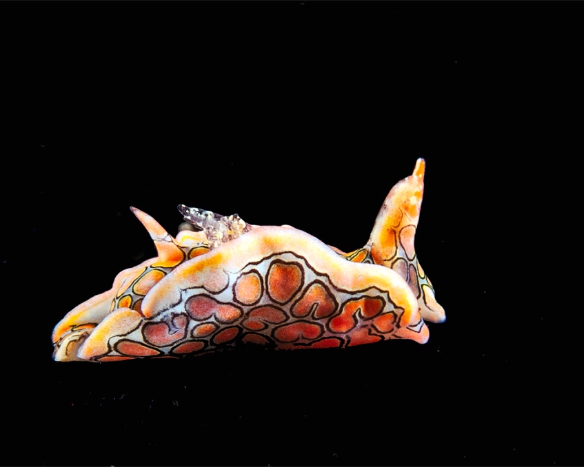 If the structures get your interest we should understand that they come from nudibranchs. In this case a Goniobranchus. Here he is sitting on the black telescope felt.