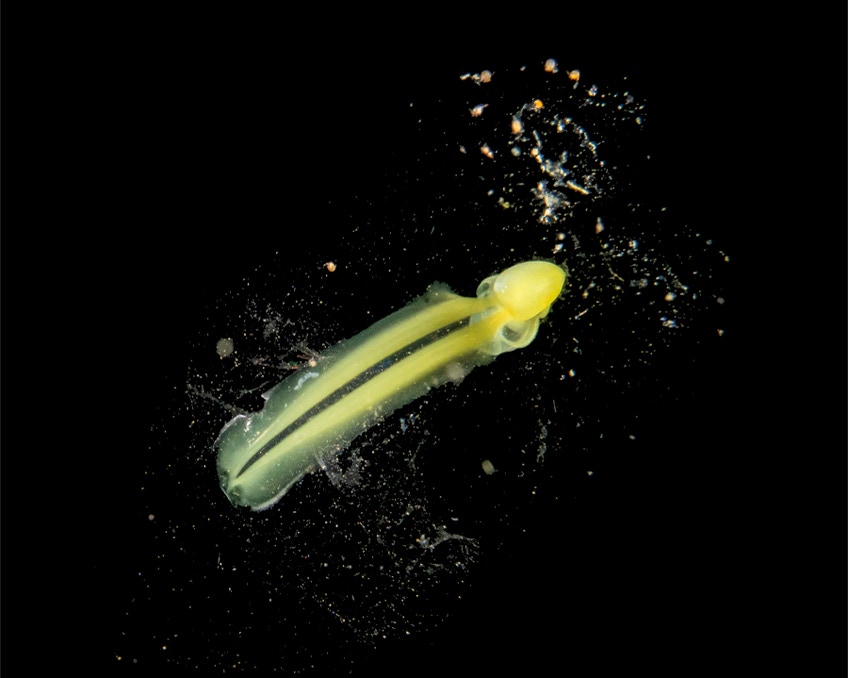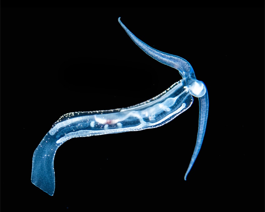 Here is a nice little Larvacean from our recent trip to Indonesia, shot on a blackwater dive. Larvaceans are tunicates that remain pelagic. The house you see around him is made up of polysaccharide and cellulose (?) and is discarded often. "A 10-year time-series study of the water column off Monterey Bay, California, revealed that the discarded mucus feeding structures of giant larvaceans carry a substantial portion of the upper ocean's productivity to the deep seabed."