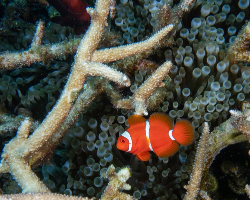 Here is one of my favorite anemone fish, the spinecheek. One question that I always wonder about is how do larval fish find their home? This guy Premnas biaculeatus lives only in a single type of anemone. Here the anemone is growing underneath a bunch of hard coral. Recent studies suggest that incoming larval fish can identify an empty anemone from one that has a single fish from one that has a pair. What they are smelling is still a mystery to me.