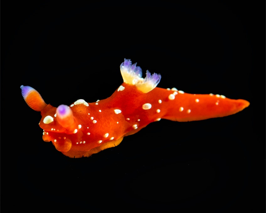 For your Christmas day, here is a nice little Martadoris limaciformis (used to be a Tambja) from our recent trip to Indonesia. Here he is on the black telescope felt stage.