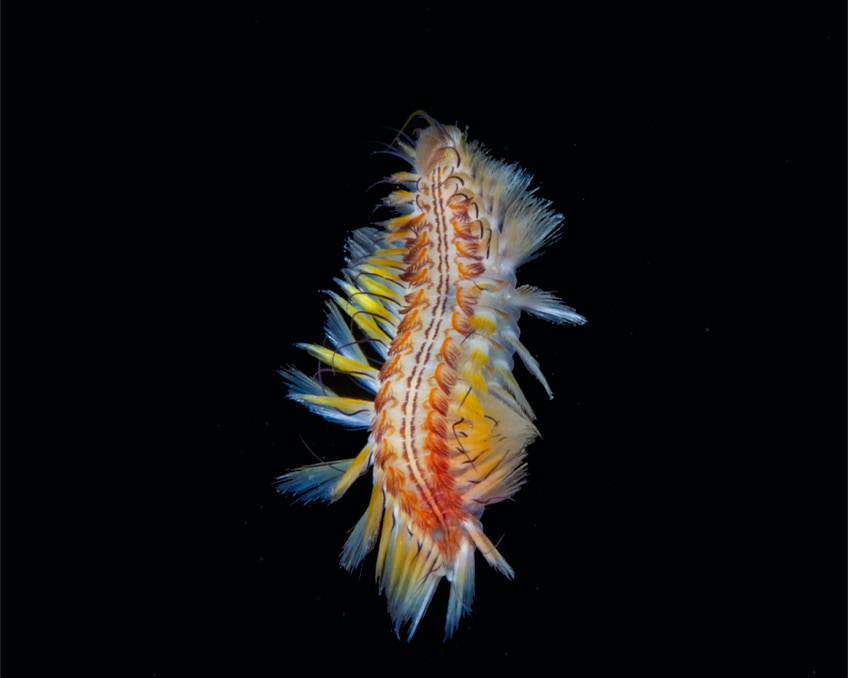 Here is a nice little fire worm from our first night dive (not blackwater but in the water column) in the Philippines.