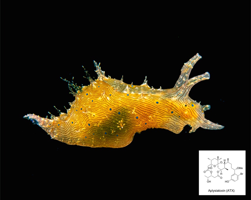 Here is a nice little sea hare Stylocheilus striatus (cool blue spots) that we often see in large piles. This guy is from our recent trip on the Samambaia and is sitting on the black telescope felt. These guys are one of only a very few species that eat cyanobacteria. From the bacteria they sequester aplysiatoxin a very potent compound with very specific and high activity against a variety of cancer types (breast, lung, colon and others). In any case good to know that cool sea creatures have some chemistry to teach us.