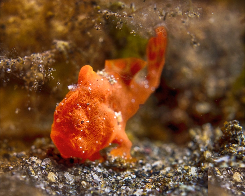 Here is a nice little orange frogfish (about a half inch long) from our recent trip to Indonesia.