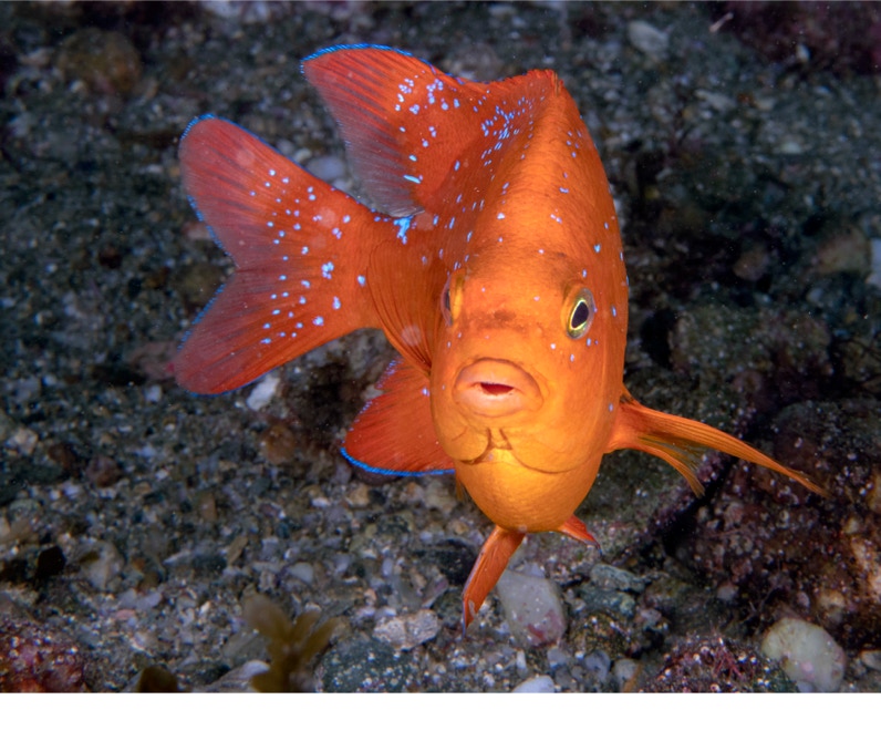 We went diving with friends (Ana, Dana, Jeff, Kelly) yesterday on our favorite boat the Giant Stride, over to Catalina Island. Not our typical "find the teeny things" dive but conditions were enormously good, calm, mostly clear warmish water. I spent a bunch of time with some juvenile Garibaldi. The juveniles have lots of blue on them. Since Garibaldi are types of Damsel Fish, they are born mean and love to chase after everyone and anyone (including divers). BUT they won't pick on the juveniles, so juveniles can swim through another fish's domain with no worries. On the other hand, the Cabrillo Aquarium has noticed that the juveniles "learn" to be mean by fighting with other juveniles.