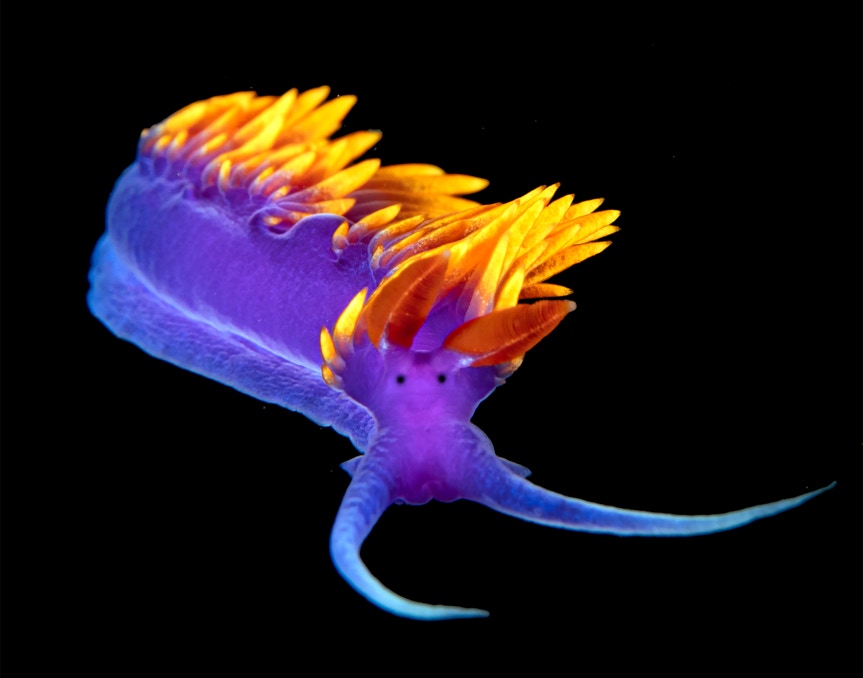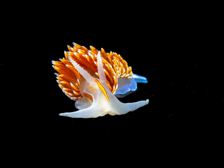 We went diving yesterday with friends on the Giant Stride. Great conditions (good vis) but quite a bit of surge. In any case here is a nice little Hermissenda sitting on the black telescope felt stage.