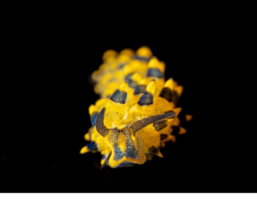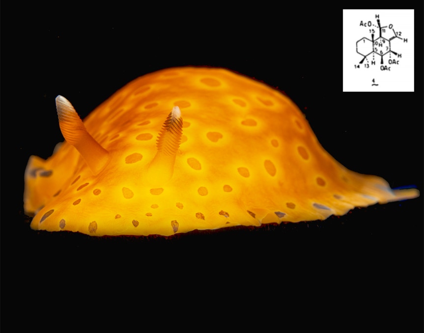 Here is a nice little Dendrodoris guttata from Bali on our last trip. Nudibranchs have a whole host of chemical defense tools and the question always arises "did he just eat something and steal its poison or did he make it himself?" In the case of Dendrodoris species, they are good chemists, making complex molecules (inset) relatively quickly and at ocean temperature, no flasks or condensers required. Here one is sitting on the black telescope stage.