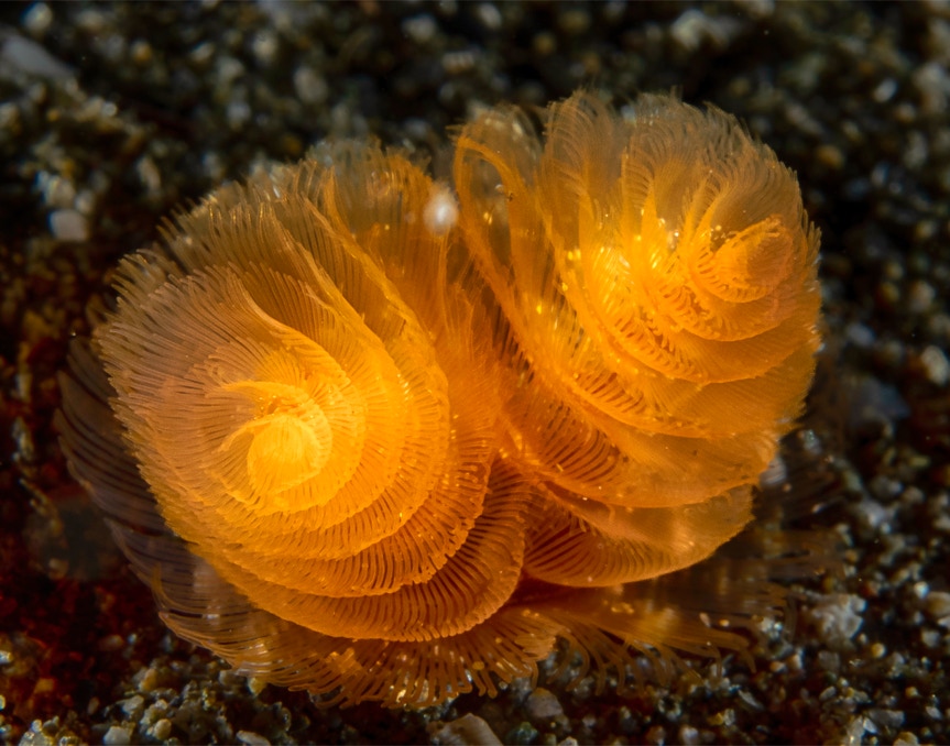 Here is a nice little tube dwelling anemone larva. We saw this on our first black water dive in Bali a few weeks ago. Tube dwelling anemones are demons. In a recent paper a group at U Kansas showed that these guys have 525 specific genes that are used to make protein based venom including neurotoxins, hemostatic toxins, protease inhibitors and a new one to me at least, a Waprin which is a toxin that is used to kill bacteria that might infect their venom glands. I guess that makes sense; if your eating or safety depends on making venom then you want to protect your venom maker. In any case, enjoy and ping me if you want a copy of the paper.