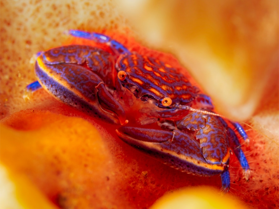 Happy Halloween! Here is a nice little crab that was sitting in a big barrel sponge. I put the strobe to illuminate through one of the ribs of the sponge. Enjoy and don't eat too much candy.