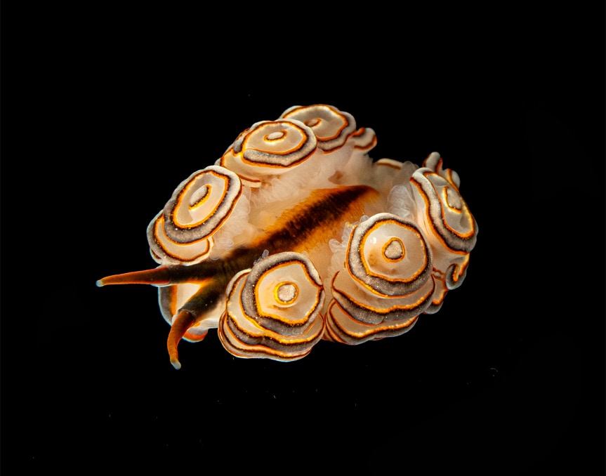 Here is a nice little Armina (sp?) from the Philippines. Sitting on the black telescope felt stage. These guys eat sea pens and from the pens they sequester some interesting molecules (some partial synthesis by the Armina) particularly homarine (see inset) which is a potent anti-inflammatory and has some activity against certain cancer types.