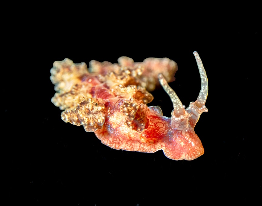 Here is a nice little Doto (SP6 in the latest Gosliner book) sitting on the black telescope felt stage. This was shot in Bali (Villa Markisa) with our friends.