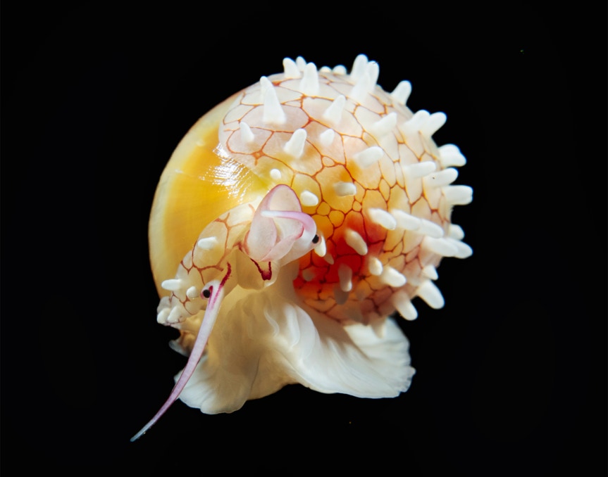 Here is a nice little soft coral cowry looking around the telescope felt stage. This is from Anilao.