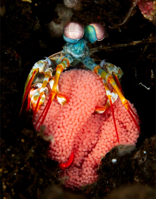 Here is something we all used to shoot (and I still do) a mantis shrimp with her eggs. If you look closely you can see what looks like a pair of eyes in each egg, but might just be a reflection from the strobe although they look too close together for that.
