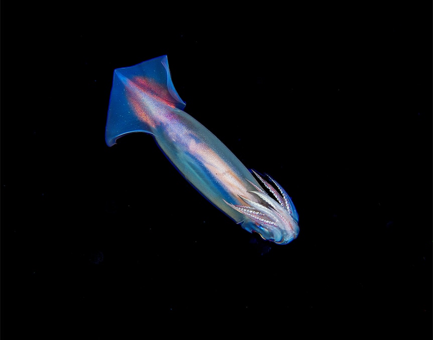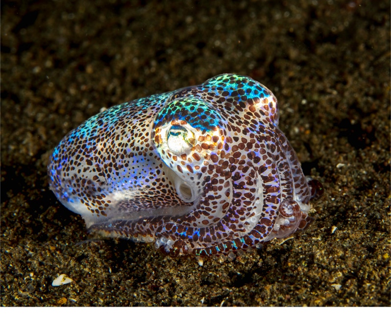 Here is a nice little bobtail squid from a night dive in Komodo. These guys were things we all shot for a long time and then the fashion changed to more strange and unusual things. I think they still are quite pretty. These guys are quite ingenious. They have a symbiotic bacteria (Vibrio fischeri) that inhabit the "light organ". The bacteria are luminescent and "hide" the squid from below by matching the light hitting the mantle. This is amazing camouflage (not so good on the sand). The chemistry of the light creation is the same as the firefly using luciferase as the catalyst. In any case, enjoy and as always if you want the paper about the chemistry let me know.