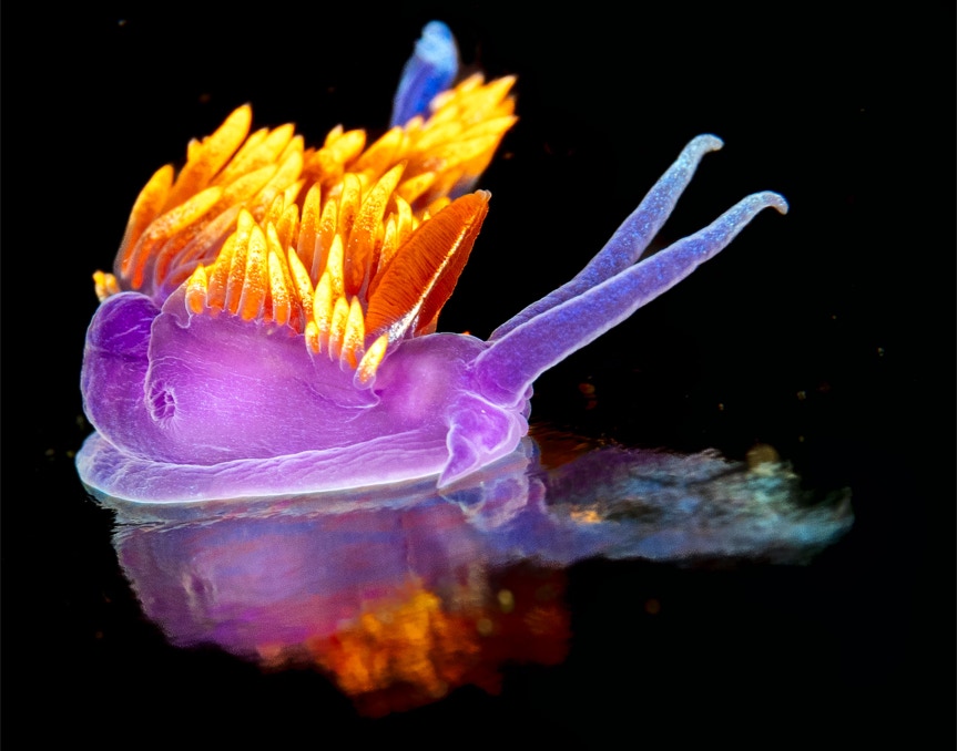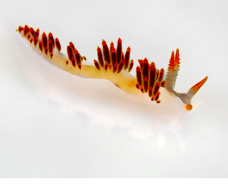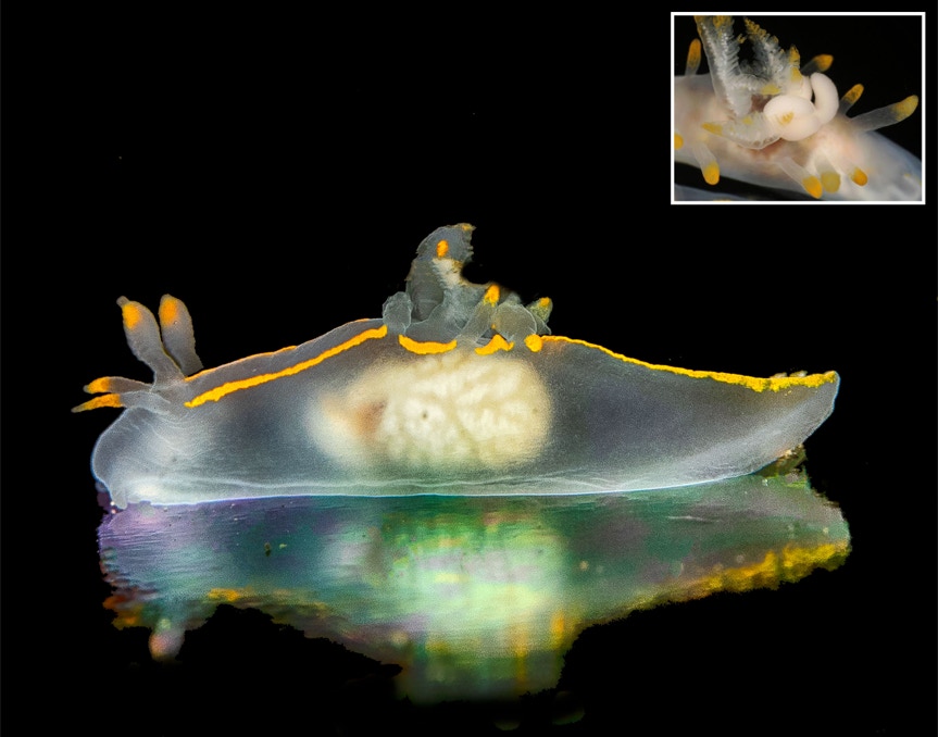 Today's nudibranch is Ancula gibbosa that Dana found for me last week here in California. They are neat little guys and here he is on the black dichroic glass stage. Unfortunately for these guys, there is a copepod (Splanchnotrophus willemi) that thinks the nudibranch is a good place to live. The inset shows the copepod on the gills a different nudi (not my pic). So if you are diving and looking for nudibranchs, keep your eye out for a possible hitchhiker.