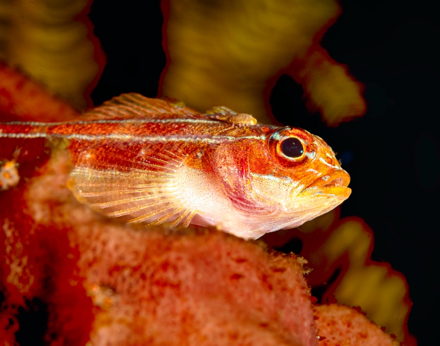 Here is a nice little blenny from Komodo who has a parasite attached to him. Not fun I suspect. Also I think you can see an out of focus ladybug at the left of the frame. Enjoy.