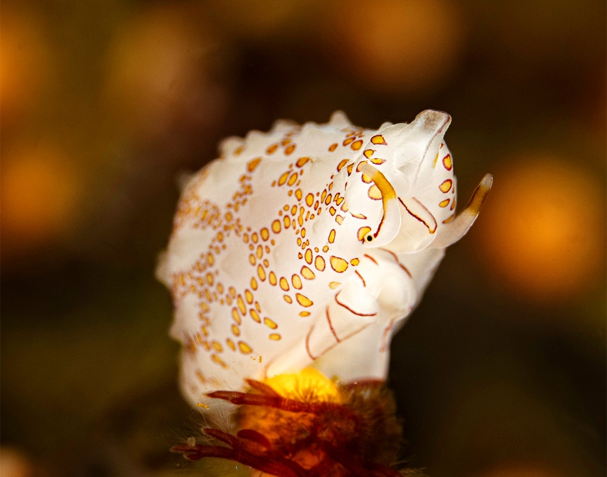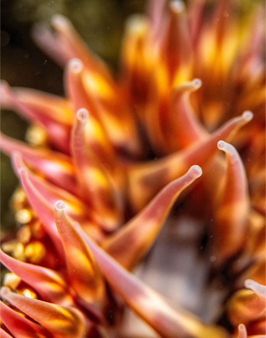 We went diving yesterday with friends on the Giant Stride. Topside conditions were mostly amazing and the water was cold but nice to be back blowing bubbles. Photographically it was not exciting; even Biodome had minimal life, and not a single Hermessinda. I was playing with shallow DOF and color, here is a nice little anemone from Biodome. Enjoy.