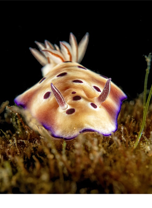 Here is a nice little Goniobranchus leopardus (I think) from Komodo sitting on the reef. These guys are good chemists. Mostly nudibranchs eat something toxic and sequester that poison to keep from being someone's lunch. These guys take a simple precursor, and successfully rearrange it into 5 other molecules all the while maintaining 3 different chiral centers (that. is like magic), and they do it at body temperature. To replicate the synthetic pathway, boiling in lye and then again in hydrochloric acid was necessary to get a piece of the way to the new molecule. In any case enough chemistry, enjoy.