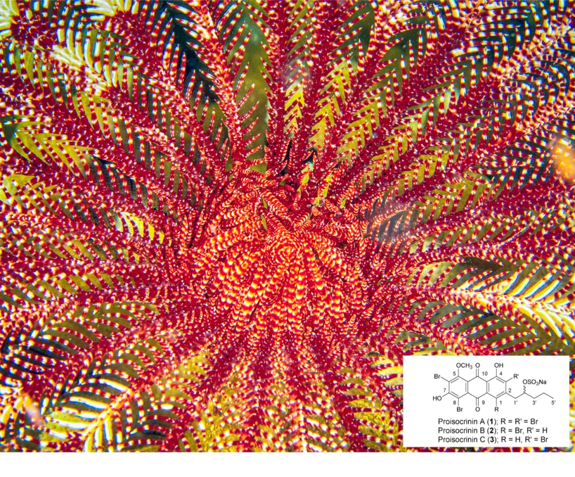 Here is a nice (not so little) crinoid from Komodo. Crinoids are related to sea stars and urchins and have been around for hundreds of millions of years. Many of them are brightly colored (and they stick like mad to your wetsuit if you get too close, and somehow I always get too close). This guy is bright red/orange and yellow and contains pro-isocrinin one of the very few molecules from any sea creature that contains multiple bromines. How he decided to make the color and why is he colored is a mystery. In any case enjoy.
