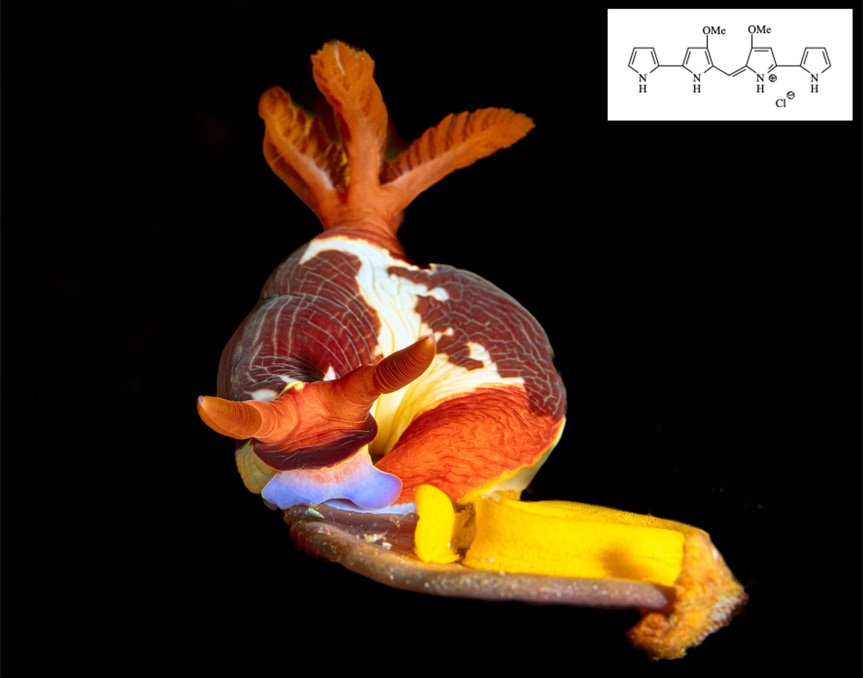 Here is a nice little Nembrotha purpureolineata (I think) laying eggs on the top of a leaf like sponge from our recent trip to Komodo with friends. These guys were quite abundant and quite often seen mating. I am fascinated with the colors of nudibranchs, how do they make/get such cool colors. The blue in this guy is likely the molecule shown in the inset which has been shown to be a potent antimicrobial against B. subtilis (and god knows we need new antibiotics). In any case enjoy.