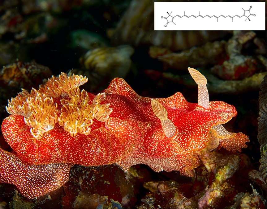 Here is a nice not so little Spanish Dancer from Komodo. This guy was probably 3-4 inches long (75 to 100 mm for those of you unfamiliar with the US Customary Units) and quite striking. I am always amazed at colors of nudibranchs. The inset shows the structure of the red color of Hexabranchus, and it is made in-house so to speak, nothing he eats has this molecule. In any case, enjoy.