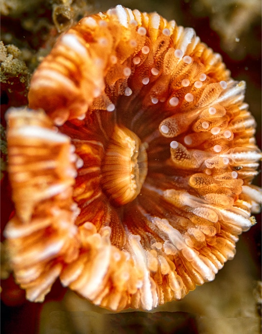 Here is a nice little Paracyathus stearnsi we found yesterday on our dive with friends. This is a stony coral that has been studied extensively to help understand how genes flow amongst beasties that stay where they are born and those that are planktonically dispersed (stearnsi). In general species that are widely dispersed will have larger genetic variability than those that stay at home. In any case enjoy.