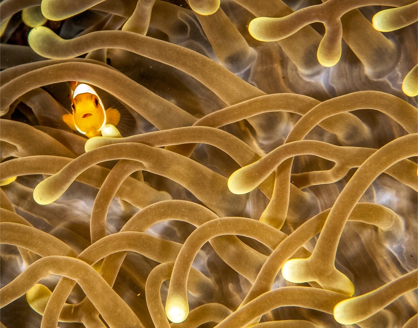 Here is a very tiny Clown Anemone Fish from Komodo. Very small guy (compare to the tentacles). Enjoy